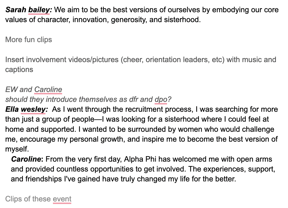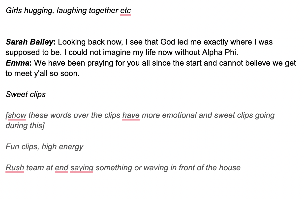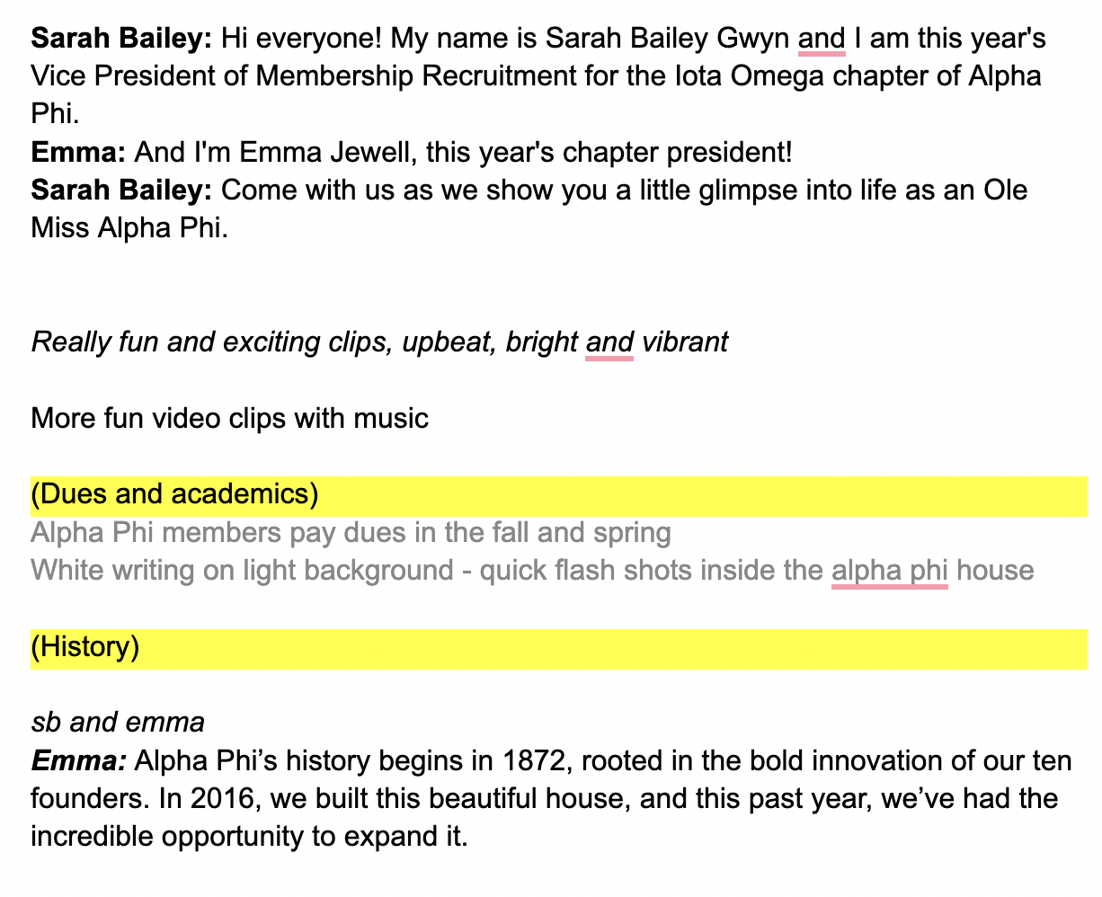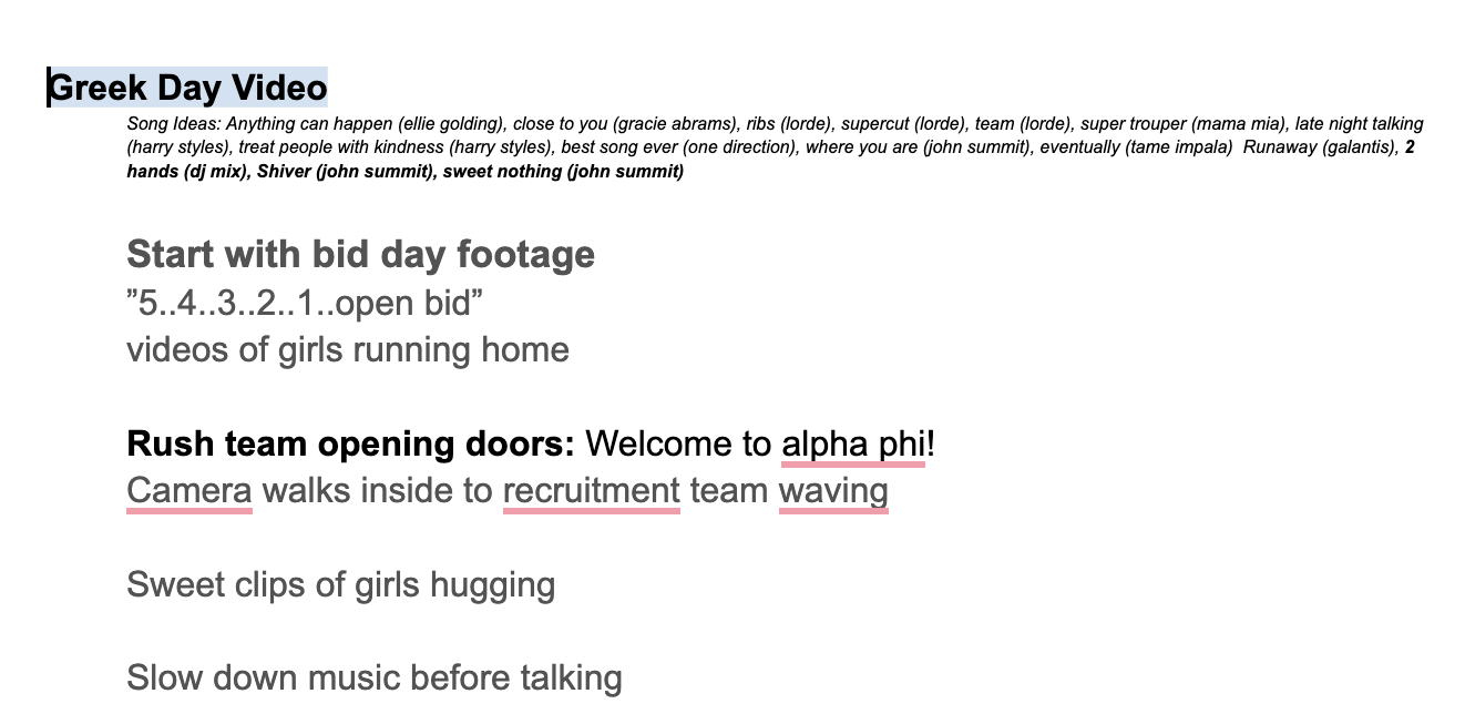 Led the creative direction and marketing strategy for Alpha Phi recruitment videos, designing content specifically tailored to prospective new members. Developed the overall vision, narrative structure, and scripting to reflect chapter values while balancing emotional storytelling with high-energy moments. Worked closely with a videographer to communicate creative direction, including shot lists, pacing, music selection, transitions, and visual tone, ensuring a cohesive and engaging final product. Guided featured speakers and curated footage to authentically showcase sisterhood, involvement, and chapter culture, using video as a strategic recruitment and branding tool.